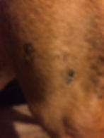 What's left of the right shoulder tumor, today. All of the hair has filled in the area. Skin appears healed. Some pigmentation of the hair is still visible.